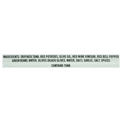 INGREDIENTS: Skipjack Tuna, Red Potatoes, Olive Oil, Red Wine Vinegar, Red Bell Pepper Green Beans, Water, Olives (Black Olives, Water, Salt), Garlic, Salt, Spices.