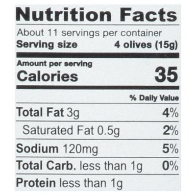 INGREDIENTS: Organic Pitted Kalamata Olives, Water, Sea Salt, Organic Vinegar.