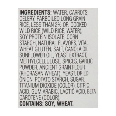 INGREDIENTS: Water, Carrots, Celery, Parboiled Long Grain Rice, Less than 2% of: Cooked Wild Rice (Wild Rice, Water), Soy Protein Isolate, Corn Starch, Natural Flavors, Vital Wheat Gluten, Salt, Canola Oil, Sunflower Oil, Yeast Extract, Methylcellulose, Spices, Garlic Powder, Ancient Grain Flour (Khorasan Wheat), Yeast, Dried Onion, Potato Starch, Sugar, Titanium Dioxide (Color), Citric Acid, Gum Arabic, Lactic Acid, Beta Carotene (Color).