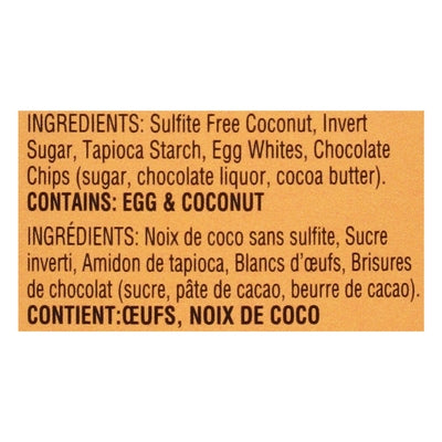 INGREDIENTS: Sulfite Free Coconut, Invert Sugar, Tapioca Starch, Egg Whites, Chocolate Chips (Sugar, Chocolate Liquor, Cocoa Butter).