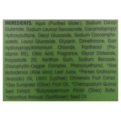 INGREDIENTS: Aqua (Purified Water), Sodium Cocoyl Glutamate, Sodium Lauroyl Sarcosinate, Cocamidopropyl Hydroxysultaine, Decyl Glucoside, Sodium Cocoaamphoacetate, Lauryl Glucoside, Glycerin, Dimethicone, Guar Hydroxypropyltrimonium Chloride, Panthenol (Pro-Vitamin B5), Citric Acid, Fragrance, Glycol Distearate, Polysobate 20, Xanthan Gum, Sodium Benzoate Chlorophyilin-Copper Complex, Phenoxyethanol, Aloe Barbadensis (Aloe Vera) Leaf Juice (USDA Certified Organic), Persea Gratissing (Avocado) Oil (USDA Certified Organic), Litchi (Lychee) Chinesis Fruit Extract, Olea Europaea (Olive) Fruit Oil (USDA Certified Organic), Chenopodium Quinoa Seed Extract (USDA Certified Organic), Butyrospermum Parkii (Shea) Butter (USDA Certified Organic), Helianthus Annuus (Sunflower) Seed Oil.