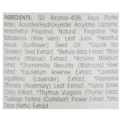INGREDIENTS: SD Alcohol-40b, Aqua (Purified Water), Acrylates/Hydroxyester Acrylates Copolymer, Aminomethyl Propanol, Natural Acrylates Copolumer, Aminomethyl Propanol, Natural, Fragrance, Aloe Barbadensis (Aloe Vera) Leaf Juice (USDA Certified Organic), Helianthus Annuus (Sunflower) Seed Oil (USDA Certified Organic), Glycine Soja (Soybean) Seed Extract (USDA Certified Organic), Betula Alba Extract (USDA Certified Organic), Malva Sylvestris (Mallow) Extract (USDA Certified Organic), Achillea Millefolium Extract (USDA Certified Organic), Chamomilla Recutita (Matricaria) Flower Extract (USDA Certified Organic), Equisetum Arvense Extract (USDA Certified Organic), Lavandula Angustifolia (Lavender) Extract (USDA Certified Organic), Rosmarinus Officinalis (Rosemary) Leaf Extract (USDA Certified Organic), Salvia Sclarea (Clary) Extract (USDA Certified Organic), Thymus Vulgaris (Thyme) Extract (USDA Certified Organic), Tussilago Farfara (Coltsfood) Flower Extract (USDA Certified Organic), Urtica Dioica (Nettle Extract).