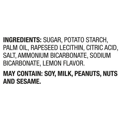 INGREDIENTS: Sugar, Potato Starch, Palm Oil, Rapeseed Lecithin, Citric Acid, Salt, Ammonium Bicarbonate, Sodium Bicarbonate, Lemon Flavor.