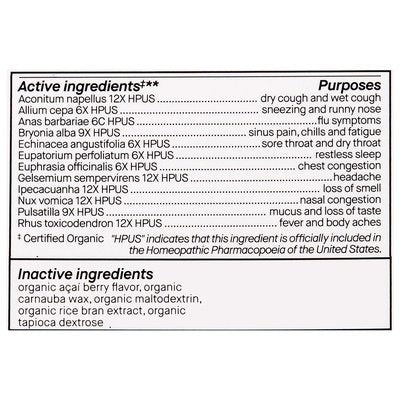 INGREDIENTS: Active Ingredients: (Certified Organic): In Each Tablet: Aconitum Napellus 12X HPUS, Allium Cepa 6X HPUS, Anas Barbariae 12X HPUS, Bryonia Alba 9X HPUS, Echinacea Angustifolia 6X HPUS, Eupatorium Perfoliatum 6X HPUS, Euphrasia Officinalis 6X HPUS, Gelsemium Sempervirens 12X HPUS, Ipecacuanha 12X HPUS, Nux Vomica 12X HPUS, Pulsatilla 9X HPUS, Rhus Toxicodendron 12X HPUS. Purpose: Dry Cough and Wet Cough, HPUS Indicates That This Ingredient is Officially Included in the Homeopathic Pharmacopoeia of the United States, Sneezing and Runny Nose, HPUS Indicates That This Ingredient is Officially Included in the Homeopathic Pharmacopoeia of the United States, Flu Symptoms, HPUS Indicates That This Ingredient is Officially Included in the Homeopathic Pharmacopoeia of the United States, Sinus Pain, Chills and Fatigue, HPUS Indicates That This Ingredient is Officially Included in the Homeopathic Pharmacopoeia of the United States, Sore Throat and Dry Throat, HPUS Indicates That This Ingredient is Officially Included in the Homeopathic Pharmacopoeia of the United States, Restless Sleep, HPUS Indicates That This Ingredient is Officially Included in the Homeopathic Pharmacopoeia of the United States, Chest Congestion, HPUS Indicates That This Ingredient is Officially Included in the Homeopathic Pharmacopoeia of the United States, Headache, HPUS Indicates That This Ingredient is Officially Included in the Homeopathic Pharmacopoeia of the United States, Loss of Smell, HPUS Indicates That This Ingredient is Officially Included in the Homeopathic Pharmacopoeia of the United States, Nasal Congestion, HPUS Indicates That This Ingredient is Officially Included in the Homeopathic Pharmacopoeia of the United States, Mucus and Loss of Taste, HPUS Indicates That This Ingredient is Officially Included in the Homeopathic Pharmacopoeia of the United States, Fever and Body Aches, HPUS Indicates That This Ingredient is Officially Included in the Homeopathic Pharmacopoeia of the United States. Inactive Ingredients: Organic Acai Berry Flavor, Organic Carnauba Wax, Organic Dextrose, Organic Maltodextrin, Organic Rice Bran Extract.