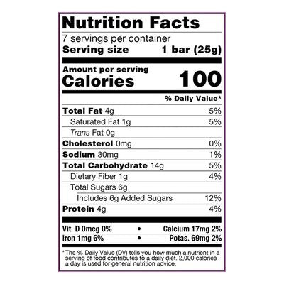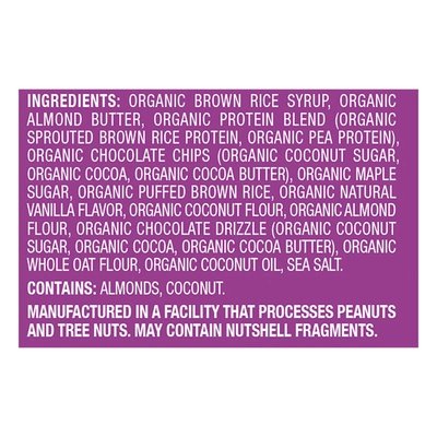 INGREDIENTS: Organic Brown Rice Syrup, Organic Almond Butter, Organic Protein Blend (Organic Sprouted Brown Rice Protein, Organic Pea Protein), Organic Chocolate Chips (Organic Coconut Sugar, Organic Cocoa, Organic Cocoa Butter), Organic Maple Sugar, Organic Puffed Brown Rice, Organic Natural Vanilla Flavor, Organic Coconut Flour, Organic Almond Flour, Organic Chocolate Drizzle (Organic Coconut Sugar, Organic Cocoa, Organic Cocoa Butter), Organic Whole Oat Flour, Organic Coconut Oil, Sea Salt.