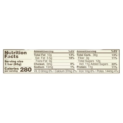 PRODUCT DETAILS: 11 g protein. Organic. Vegan. Gluten-free. USDA Organic. Certified Organic by Quality Assurance International. Certified Vegan. Vegan.org. Certified Gluten Free. gfco.org. Non-GMO Project verified. nongmoproject.org. Everlasting joy. Live long. Eat positive. Give back. Tread lightly. Be well. Mother-Daughter owned and based in a small rural community, our mission is to spread awareness for a balanced, plant-based lifestyle with products that make a positive impact on the planet. This MacroBar is made with high-quality, sustainably sourced, plant-based ingredients using 100% renewable energy to help you have a healthy body, sharp mind, and bold spirit. Join us as we make the world better, one bite at a time. Certified C.L.E.A.N. Approver Food Product. FODMAP Friendly. gomacro.com. 1-833-Gomacro (1-833-466-2276); gomacro.com. Your purchase of this bar will help feed the homeless. Terracycle. gomacro.com/recycle.