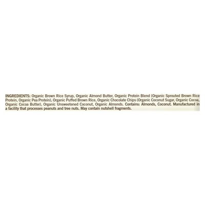 INGREDIENTS: Organic Brown Rice Syrup, Organic Almond Butter, Organic Protein Blend (Organic Sprouted Brown Rice Protein, Organic Pea Protein), Organic Puffed Brown Rice, Organic Chocolate Chips (Organic Coconut Sugar, Organic Cocoa, Organic Cocoa Butter), Organic Unsweetened Coconut, Organic Almonds.