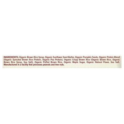 INGREDIENTS: Organic Brown Rice Syrup, Organic Sunflower Seed Butter, Organic Pumpkin Seeds, Organic Protein Blend (Organic Sprouted Brown Rice Protein, Organic Pea Protein), Organic Crispy Brown Rice (Organic Brown Rice, Organic Brown Rice Syrup, Sea Salt), Organic Puffed Brown Rice, Organic Maple Sugar, Organic Natural Flavor, Sea Salt.
