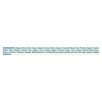 INGREDIENTS: Organic Brown Rice Syrup, Organic Peanut Butter, Organic Sprouted Brown Rice Protein, Organic Peanut Butter Chips (Organic Peanut Flour, Organic Cocoa Butter, Organic Coconut Sugar, Salt), Organic Puffed Brown Rice, Organic Peanuts.