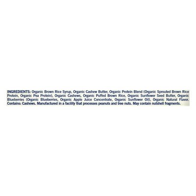 INGREDIENTS: Organic Brown Rice Syrup, Organic Cashew Butter, Organic Protein Blend (Organic Sprouted Brown Rice Protein, Organic Pea Protein), Organic Cashews, Organic Puffed Brown Rice, Organic Sunflower Seed Butter, Organic Blueberries (Organic Blueberries, Organic Apple Juice Concentrate, Organic Sunflower Oil), Organic Natural Flavor.