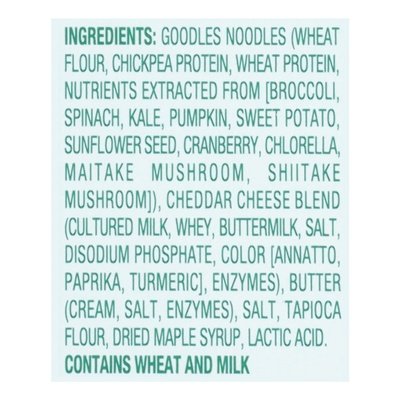 INGREDIENTS: Goodles Macaroni (Wheat Flour, Chickpea Protein, Wheat Protein, Nutrients Extracted from [Broccoli, Spinach, Kale, Pumpkin, Sweet Potato, Sunflower Seed, Cranberry, Chlorella, Maitake Mushroom, Shiitake Mushroom]), Cheddar Cheese Blend (Cultured Milk, Whey, Buttermilk, Salt, Disodium Phosphate, Color [Annatto, Paprika, Turmeric], Enzymes), Butter (Cream, Salt), Salt, Tapioca Flour, Dried Maple Syrup, Lactic Acid.