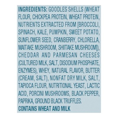 INGREDIENTS: Goodles Shells (Wheat Flour, Chickpea Protein, Wheat Protein, Nutrients Extracted from [Broccoli, Spinach, Kale, Pumpkin, Sweet Potato, Sunflower Seed, Cranberry, Chlorella, Maitake Mushroom, Shitake Mushroom]), Cheddar and Parmesan Cheeses (Cultured Milk, Salt, Disodium Phosphate, Enzymes), Whey, Natural Flavor, Butter (Cream, Salt), Nonfat Dry Milk, Salt, Tapioca Flour, Nutritional Yeast, Lactic Acid, Porcini Mushrooms, Black Pepper, Paprika, Ground Black Truffles.