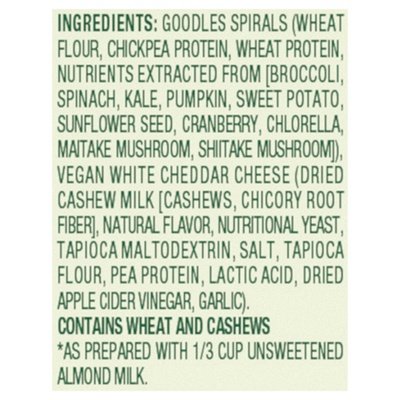 INGREDIENTS: Goodles Noodles (Wheat Flour, Chickpea Protein, Wheat Protein, Nutrients Extracted from [Broccoli, Spinach, Kale, Pumpkin, Sweet Potato, Sunflower Seed, Cranberry, Chlorella, Maitake Mushroom Shiitake Mushroom]), Vegan White Cheddar (Dried Cashew Milk [Cashews, Chicory Root Fiber], Natural Flavor, Nutritional Yeast, Tapioca Maltodextrin, Salt, Tapioca Flour, Pea Protein, Lactic Acid, Dried Apple Cider Vinegar, Garlic)