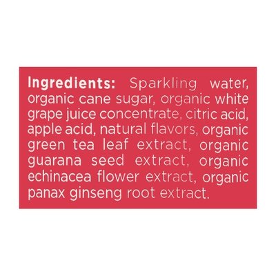 INGREDIENTS:  Sparkling Water, Organic Cane Syrup, Organic White Grape Juice Concentrate, Citric Acid, Apple Acid, Natural Flavors, Organic Green Tea Leaf Extract, Organic Guarana Seed Extract, Organic Echinacea Flower Extract, Organic Panax Ginseng Root Extract.