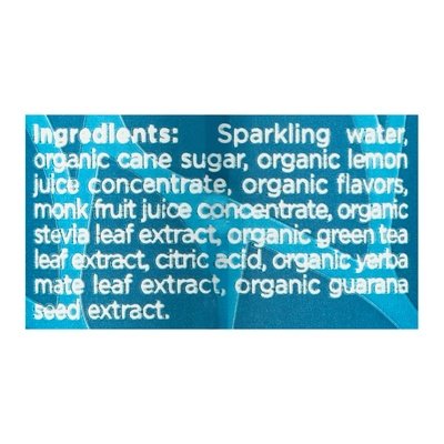 INGREDIENTS: Sparkling Water, Organic Cane Sugar, Organic Lemon Juice Concentrate, Organic Flavors, Monk Fruit Juice Concentrate, Organic Stevia Leaf Extract, Organic Green Tea Leaf Extract, Citric Acid, Organic Yerba Mate Leaf Extract, Organic Guarana Seed Extract.
