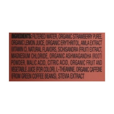 INGREDIENTS: Filtered Water, Organic Strawberry Puree, Organic Lemon Juice, Organic Erythritol, Amla Extract (Vitamin C), Natural Flavors, Schisandra (Fruit) Extract, Magnesium Chloride, Organic Ashwagandha (Root) Powder, Malic Acid, Citric Acid, Organic Fruit and Vegetable Juice (for Color), L-Theanine, Organic Caffeine (from Green Coffee Beans), Stevia Extract.