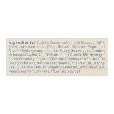 INGREDIENTS: Sodium Cocoyl Isethionate (Coconut Oil (Derived Source)), Butyrospermum Parkii (Shea Butter), Glycerin (Vegetable Based (Derived Source)), Hydroxypropyltrimonium Honey (Honeyquat), Aleurites Moluccana (Kukui) Nut Oil, Panthenol (Vitamin B5), Hydrogenated Ethylhexyl Olivate (Olive Oil (Derived Source)), Hydrogenated Olive Oil Unsaponifiables, Natural Fragrance (Lime Peel Oil, Orange Peel Oil, Lemon Peel Oil, Grapefruit Peel Oil, Ginger Root Oil), Mineral Pigment CI 77288.