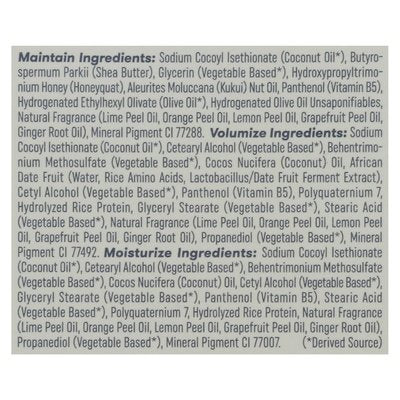 INGREDIENTS: Maintain Ingredients: Sodium Cocoyl Isethionate (Coconut Oil (Derived Source)), Butyrospermum Parkii (Shea Butter), Glycerin (Vegetable Based (Derived Source)), Hydroxypropyltrimonium Honey (Honeyquat), Aleurites Moluccana (Kukui) Nut Oil, Panthenol (Vitamin B5), Hydrogenated Ethylhexyl Olivate (Olive Oil (Derived Source)), Hydrogenated Olive Oil Unsaponifiables, Natural Fragrance (Lime Peel Oil, Orange Peel Oil, Lemon Peel Oil, Grapefruit Peel Oil, Ginger Root Oil), Mineral Pigment CI 77288. Volumize Ingredients: Sodium Cocoyl Isethionate (Coconut Oil (Derived Source)), Cetearyl Alcohol (Vegetable Based (Derived Source)), Behentrimonium Methosulfate (Vegetable Based (Derived Source)), Cocos Nucifera (Coconut) Oil, African Date Fruit (Water, Rice Amino Acids, Lactobacillus/Date Fruit Ferment Extract), Cetyl Alcohol (Vegetable Based (Derived Source)), Panthenol (Vitamin B5), Polyquaternium 7, Hydrolyzed Rice Protein, Glyceryl Stearate (Vegetable Based (Derived Source)), Stearic Acid (Vegetable Based (Derived Source)), Natural Fragrance (Lime Peel Oil, Orange Peel Oil, Lemon Peel Oil, Grapefruit Peel Oil, Ginger Root Oil), Propanediol (Vegetable Based (Derived Source)), Mineral Pigment CI 77492. Moisturize Ingredients: Sodium Cocoyl Isethionate (Coconut Oil (Derived Source)), Cetearyl Alcohol (Vegetable Based (Derived Source)), Behentrimonium Methosulfate (Vegetable Based (Derived Source)), Cocos Nucifera (Coconut) Oil, Cetyl Alcohol (Vegetable Based (Derived Source)), Glyceryl Stearate (Vegetable Based (Derived Source)), Panthenol (Vitamin B5), Stearic Acid (Vegetable Based (Derived Source)), Polyquaternium 7, Hydrolyzed Rice Protein, Natural Fragrance (Lime Peel Oil, Orange Peel Oil, Lemon Peel Oil, Grapefruit Peel Oil, Ginger Root Oil), Propanediol (Vegetable Based (Derived Source)), Mineral Pigment CI 77007.