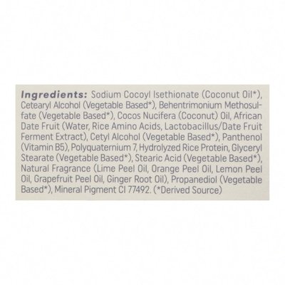 INGREDIENTS: Sodium Cocoyl Isethionate (Coconut Oil (Derived Source)), Cetearyl Alcohol (Vegetable Based (Derived Source)), Behentrimonium Methosulfate, (Vegetable Based (Derived Source)), Cocos Nucifera (Coconut) Oil, African Date Fruit (Water, Rice Amino Acids, Lactobacillus/Date Fruit Ferment Extract), Cetyl Alcohol (Vegetable Based (Derived Source)), Panthenol (Vitamin B5), Polyquaternium 7, Hydrolyzed Rice Protein, Glyceryl Stearate (Vegetable Based (Derived Source)), Stearic Acid (Vegetable Based (Derived Source)), Natural Fragrance (Lime Peel Oil, Orange Peel Oil, Lemon Peel Oil, Grapefruit Peel Oil, Ginger Root Oil), Propanediol (Vegetable Based), Mineral Pigment CI 77492.