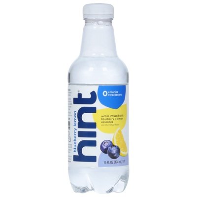 PRODUCT DETAILS: Water infused with blueberry + lemon essences and other natural flavors. Hint is vegan and free of sugar, sweeteners, MSG, nuts, soy, gluten and preservatives. 0 calories. 0 sweeteners. Water that makes you love water. drinkhint.com. (at)hint. Learn more about our BPA-free bottles at drinkhint.com. 100% recyclable bottle & cap. Made in USA.