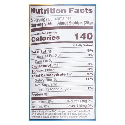 INGREDIENTS: Chickpea Tortilla Chip (Chickpea Flour, White Corn Flour, Yellow Corn Flour, Pea Hull Fiber), Canola Oil and/or Sunflower Oil, Ranch Seasoning (Tapioca Solids, Sea Salt, Cane Sugar, Onion Powder, Vinegar Powder (Maltodextrin, White Distilled Vinegar), Natural Flavor, Garlic Powder, Spices, Tomato Powder, Yeast Extract, Citric Acid).