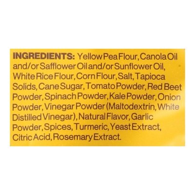 INGREDIENTS: Yellow Pea Flour, Canola Oil and/or Safflower Oil and/or Sunflower Oil, White Rice Flour, Corn Flour, Salt, Tapioca Solids, Cane Sugar, Tomato Powder, Red Beet Powder, Spinach Powder, Kale Powder, Onion Powder, Spinach Powder, Kale Powder, Onion Powder, Vinegar Powder (Maltodextrin, White Distilled Vinegar), Natural Flavor, Garlic Powder, Spices, Turmeric, Yeast Extract, Citric Acid, Rosemary Extract.