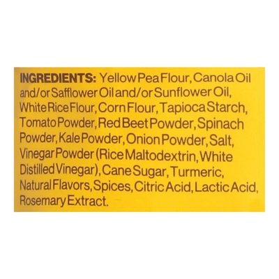 INGREDIENTS: Yellow Pea Flour, Canola Oil and/or Safflower Oil and/or Sunflower Oil, White Rice Flour, Corn Flour, Tapioca Starch, Tomato Powder, Red Beet Powder, Spinach Powder, Kale Powder, Onion Powder, Salt, Vinegar Powder (Rice Maltodextrin, White Distilled Vinegar), Cane Sugar, Turmeric, Natural Flavors, Spices, Citric Acid, Lactic Acid, Rosemary Extract.