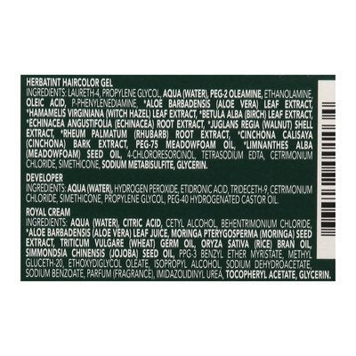 INGREDIENTS: Herbatint Haircolor Gel Ingredients: Laureth-4, Propylene Glycol, Aqua (Water), PEG2 Oleamine, Ethanolamine, Oleic Acid, P-Phenylenediamine, Aloe Barbadensis (Aloe Vera) Leaf Extract (Organic Certified), Hamamelis Virginiana (Witch Hazel) Leaf Extract (Organic Certified), Betula Alba (Birch) Leaf Extract (Organic Certified), Echinacea Angustifolia (Echinacea) Root Extract (Organic Certified), Juglans Regia (Walnut) Shell Extract (Organic Certified), Rheum Palmatum (Rhubarb) Root Extract (Organic Certified), Cinchona Calisaya (Cinchona) Bark Extract (Organic Certified), PEG-75 Meadowfoam Oil, Limnanthes Alba (Meadowfoam) Seed Oil (Organic Certified), 4-Chlororesorcinol, Tetrasodium EDTA, Cetrimonium Chloride, Simethicone, Sodium Metabisulfite, Glycerin. Developer Ingredients: Aqua (Water), Hydrogen Peroxide, Etidronic Acid, Trideceth-9, Cetrimonium Chloride, Simethicone, Propylene Glycol, PEG-40 Hydrogenated Castor Oil. Royal Cream Ingredients: Aqua (Water), Citric Acid, Cetyl Alcohol, Behentrimonium Chloride, Aloe Barbadensis (Aloe Vera) Leaf Juice (Organic Certified), Moringa Pterygosperma (Moringa) Seed Extract, Triticum Vulgare (Wheat) Germ Oil, Oryza Sativa (Rice) Bran Oil, Simmondsia Chinensis (Jojoba) Seed Oil, PPG-3 Benzyl Ether Myristate, Methyl Gluceth-20, Ethoxydiglycol Oleate, Isopropyl Alcohol, Sodium Dehydroacetate, Sodium Benzoate, Parfum/(Fragrance), in/Idazolidinyl Urea, Tocopheryl Acetate, Glycerin.