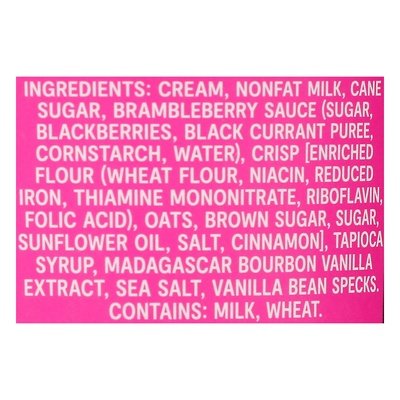 INGREDIENTS: Cream, Nonfat Milk, Cane Sugar, Brambleberry Sauce (Sugar, Blackberries, Black Currant Puree, Cornstarch, Water), Crisp [Enriched Flour (Wheat Flour, Niacin, Reduced Iron, Thiamine Mononitrate, Riboflavin, Folic Acid), Oats, Brown Sugar, Sugar, Sunflower Oil, Salt, Cinnamon], Tapioca Syrup, Madagascar Bourbon Vanilla Extract, Sea Salt, Vanilla Bean Specks.