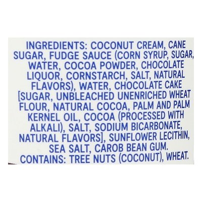 INGREDIENTS: Coconut Cream, Cane Sugar, Fudge Sauce (Corn Syrup, Sugar, Water, Cocoa Powder, Chocolate Liquor, Cornstarch, Salt, Natural Flavors), Water, Chocolate Cake [Sugar, Unbleached Unenriched Wheat Flour, Natural Cocoa, Palm and Palm Kernel Oil, Cocoa (Processed with Alkali), Salt, Sodium Bicarbonate, Natural Flavors], Sunflower Lecithin, Sea Salt, Carob Bean Gum.