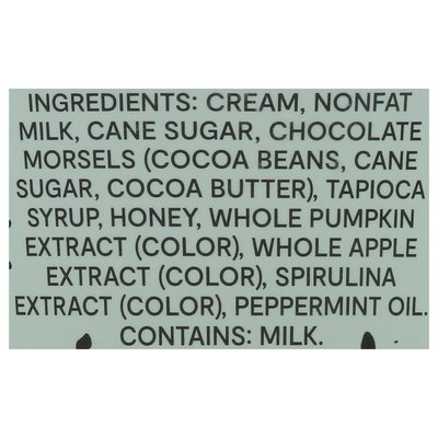 INGREDIENTS: Cream, Nonfat Milk, Cane Sugar, Chocolate Morsels (Cocoa Beans, Cane Sugar, Cocoa Butter), Tapioca Syrup, Honey, Whole Pumpkin Extract (Color), Spirulina Extract (Color), Peppermint Oil.