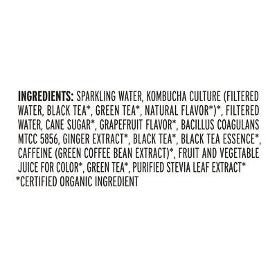 INGREDIENTS: Sparkling Water, Kombucha Culture (Filtered Water, Black Tea (Certified Organic Ingredient), Green Tea (Certified Organic Ingredient), Natural Flavor (Certified Organic Ingredient)) (Certified Organic Ingredient), Filtered Water, Cane Sugar (Certified Organic Ingredient), Grapefruit Flavor (Certified Organic Ingredient), Bacillus Coagulans Mtcc 5856, Ginger Extract (Certified Organic Ingredient), Black Tea (Certified Organic Ingredient), Black Tea Essence (Certified Organic Ingredient), Caffeine (Green Coffee Bean Extract) (Certified Organic Ingredient), Fruit and Vegetable Juice for Color (Certified Organic Ingredient), Green Tea (Certified Organic Ingredient), Purified Stevia Leaf Extract (Certified Organic Ingredient).