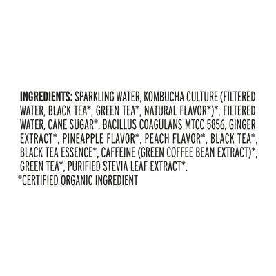 INGREDIENTS: Sparkling Water, Kombucha Culture (Filtered Water, Black Tea (Certified Organic Ingredient), Green Tea (Certified Organic Ingredient), Natural Flavor (Certified Organic Ingredient)) (Certified Organic Ingredient), Filtered Water, Cane Sugar (Certified Organic Ingredient), Bacillus Coagulans MTCC 5856, Ginger Extract (Certified Organic Ingredient), Pineapple Flavor (Certified Organic Ingredient), Peach Flavor (Certified Organic Ingredient), Black Tea (Certified Organic Ingredient), Black Tea Essence (Certified Organic Ingredient), Caffeine (Green Coffee Bean Extract) (Certified Organic Ingredient), Green Tea (Certified Organic Ingredient), Purified Stevia Leaf Extract (Certified Organic Ingredient).