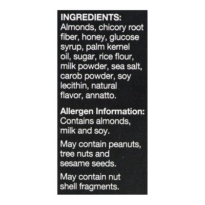 INGREDIENTS: Almonds, Chicory Root Fiber, Honey, Glucose Syrup, Palm Kernel Oil, Sugar, Rice Flour, Milk Powder, Sea Salt, Carob Powder, Soy Lecithin, Natural Flavor, Annatto.