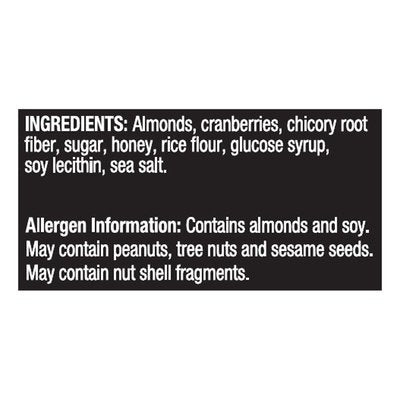 INGREDIENTS: Almonds, Cranberries, Chicory Root Fiber, Sugar, Honey, Rice Flour, Glucose Syrup, Soy Lecithin, Sea Salt.