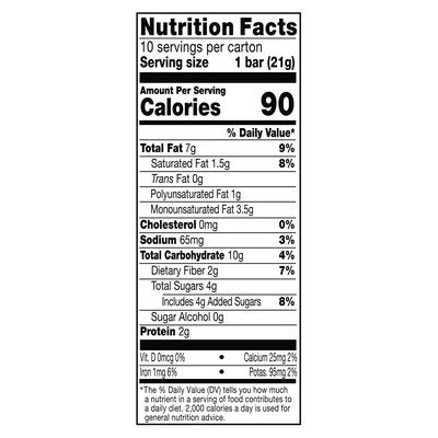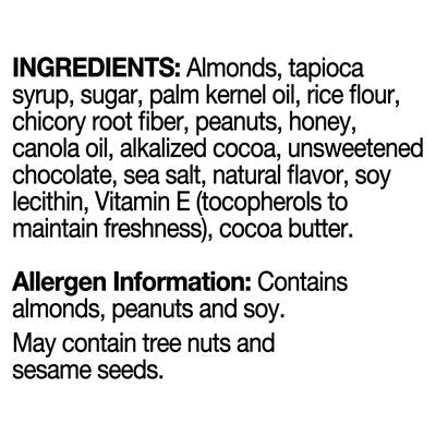 INGREDIENTS: Almonds, Tapioca Syrup, Sugar, Palm Kernel Oil, Rice Flour, Chicory Root Fiber, Peanuts, Honey, Canola Oil, Alkalized Cocoa, Unsweetened Chocolate, Sea Salt, Natural Flavor, Soy Lecithin, Vitamin E (Tocopherols to Maintain Freshness), Cocoa Butter.