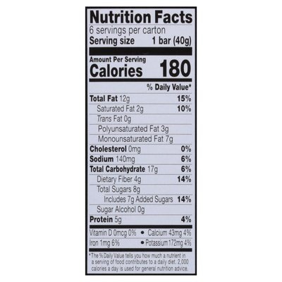 PRODUCT DETAILS: 5 g protein per serving. Made with 14 or more finely ground almonds per bar (Per USDA food data central database, the average size of 1 almond is 1.2 g). 12 g fat per serving. 0 g trans fat. Gluten free. Low sodium. Good source of fiber. Non-GMO Project verified. nongmoproject.org. New. A soft baked treat, with the wholesome nutrition of 14 or more almonds (Per USDA food data central database, the average size of 1 almond is 1.2 g). No sugar alcohols. kindsnacks.com nongmoprojectorg. www.fsc.org. Instagram. Twitter. Facebook. (at)kindsnacks. Recycle this carton. FSC. FSC: Recycled - Packaging made from recycled material. www.fsc.org. Made in Canada with domestic and imported ingredients.