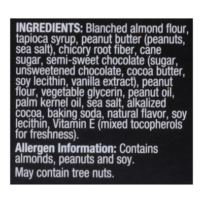 INGREDIENTS: Blanched Almond Flour, Tapioca Syrup, Peanut Butter (Peanuts, Sea Salt), Chicory Root Fiber, Cane Sugar, Semi-Sweet Chocolate (Sugar, Unsweetened Chocolate, Cocoa Butter, Soy Lecithin, Vanilla Extract), Peanut Flour, Vegetable Glycerin, Peanut Oil, Palm Kernel Oil, Sea Salt, Alkalized Cocoa, Baking Soda, Natural Flavor, Soy Lecithin, Vitamin E (Mixed Tocopherols for Freshness).