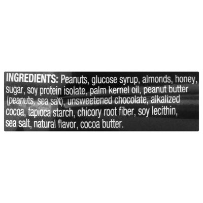 INGREDIENTS: Peanuts, Glucose Syrup, Almonds, Honey, Sugar, Soy Protein Isolate, Palm Kernel Oil, Peanut Butter (Peanuts, Sea Salt), Unsweetened Chocolate, Alkalized Cocoa, Tapioca Starch, Chicory Root Fiber, Soy Lecithin, Sea Salt, Natural Flavor, Cocoa Butter.