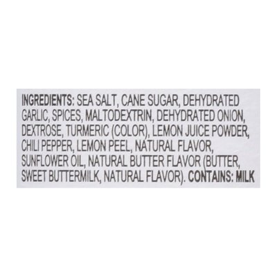 INGREDIENTS: Sea Salt, Cane Sugar, Dehydrated Garlic, Spices, Maltodextrin, Dehydrated Onion, Dextrose, Turmeric (Color), Lemon Juice Powder, Chili Pepper, Lemon Peel, Natural Flavor Sunflower Oil, Natural Butter Flavor (Butter, Sweet Buttermilk, Natural Flavor).