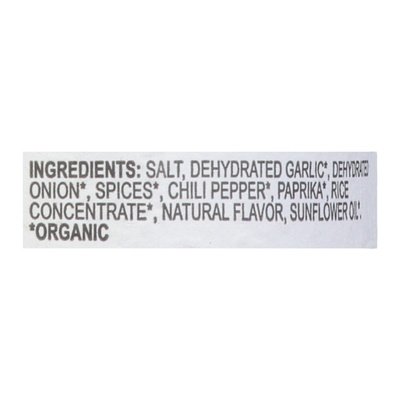 INGREDIENTS: Salt, Dehydrated Garlic (Organic), Dehydrated Onion (Organic), Spices (Organic), Chili Pepper (Organic), Paprika (Organic), Rice Concentrate (Organic), Natural Flavor, Sunflower Oil (Organic).