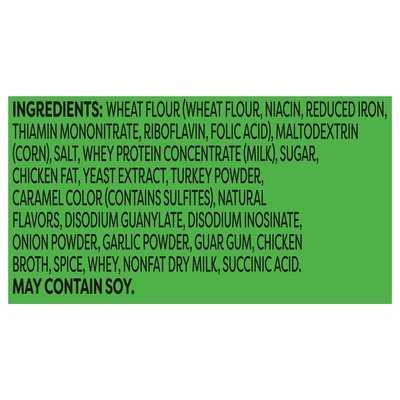 INGREDIENTS: Wheat Flour (Wheat Flour, Niacin, Reduced Iron, Thiamin Mononitrate, Riboflavin, Folic Acid), Maltodextrin (Corn), Salt, Whey Protein Concentrate (Milk), Sugar, Chicken Fat, Yeast Extract, Turkey Powder, Caramel Color (Contains Sulfites), Natural Flavors, Disodium Guanylate, Disodium Inosinate, Onion Powder, Garlic Powder, Guar Gum, Chicken Broth, Spice, Whey, Nonfat Dry Milk, Succinic Acid.