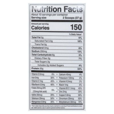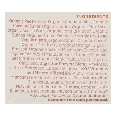 INGREDIENTS: Organic Pea Protein, Organic Coconut Milk, Organic Coconut Sugar, Organic Inulin, Organic Flax Seed, Organic Acacia Gum, Organic Vanilla Flavor, Organic Quinoa, Organic Stevia Extract, Organic Fruit and Veggie Blend (Organic Apple, Organic Carrot, Organic Cranberry, Organic Orange, Organic Broccoli, Organic Shiitake Mushroom Extract, and Organic Tomato), Himalayan Salt, Organic Pumpkin Seed Protein, Organic Monk Fruit Extract, Organic Chia Seed, Digestive Enzyme Blend (Amylases, Lactase, Proteases, Lipase, Cellulase), Kos Vitamins and Minerals Blend (DL-Alpha Tocopherol, Manganese Amino Acid Chelate, Potassium Iodide, Zinc Oxide, Selenium Amino Acid Chelate, Molybdenum Amino Acid Chelate, Copper Oxide, Riboflavin, Niacinamide, Phylloquinone, Chromium Picolinate, Folic Acid, Cyanocobalamin).