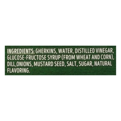 INGREDIENTS: Gherkins, Water, Distilled Vinegar, Glucose-Fructose Syrup (from Wheat and Corn), Dill, Onions, Mustard Seed, Salt, Sugar, Natural Flavoring.