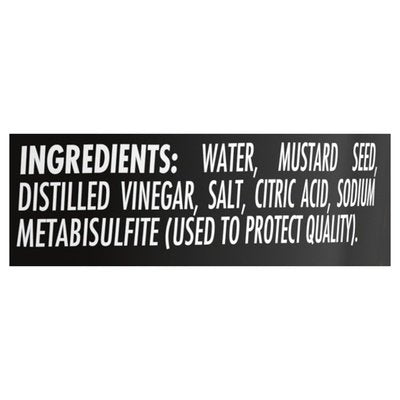 INGREDIENTS: Water, Mustard Seed, Distilled Vinegar, Salt, Citric Acid, Sodium Metabisulfite (Used to Protect Quality).