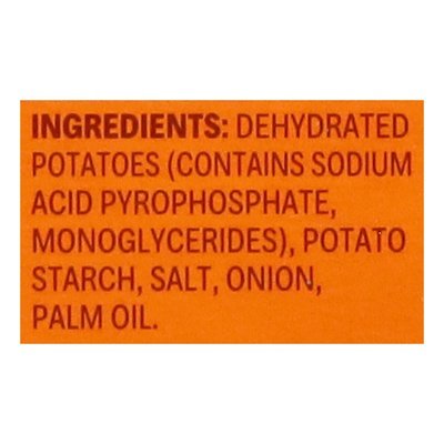 INGREDIENTS: Dehydrated Potatoes (Contains Sodium Acid Pyrophosphate, Monoglycerides), Potato Starch, Salt, Onion, Palm Oil.