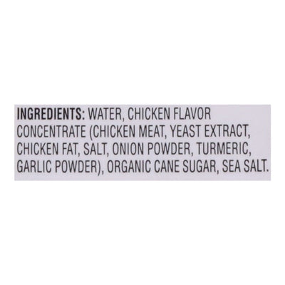 INGREDIENTS: Water, Chicken Flavor Concentrate (Chicken Meat, Yeast Extract, Chicken Fat, Salt, Onion Powder, Turmeric, Garlic Powder), Organic Cane Sugar, Sea Salt.