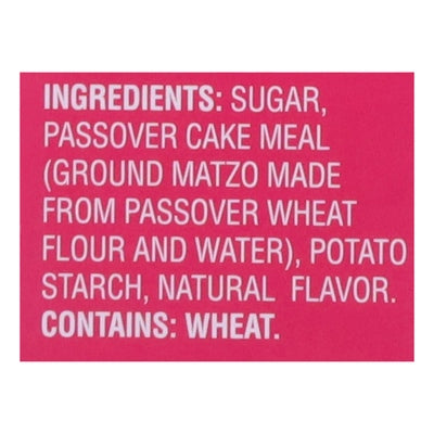 INGREDIENTS: Sugar, Passover Cake Meal (Ground Matzo Made From Passover Wheat Flour and Water), Potato Starch, Natural Flavor.