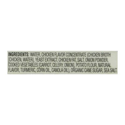 INGREDIENTS: Water, Chicken Flavor Concentrate (Chicken Broth [Chicken, Water], Yeast Extract, Chicken Fat, Salt, Onion Powder, Cooked Vegetables [Carrot, Celery, Onion], Potato Flour, Natural Flavor, Turmeric, Corn Oil, Canola Oil), Organic Cane Sugar, Sea Salt.