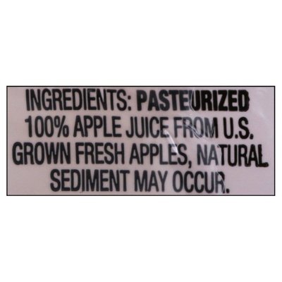 INGREDIENTS: Pasteurized 100% Apple Juice from U.S. Grown Fresh Apples, Natural Sediment May Occur.
